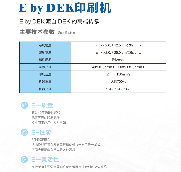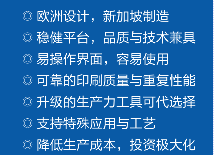 Eby DEK印刷機(jī),歐洲設(shè)計(jì),新加坡制造。穩(wěn)健平臺(tái),品質(zhì)與技術(shù)兼具,易操作界面和容易使用。可靠的印刷質(zhì)量與重復(fù)性能。