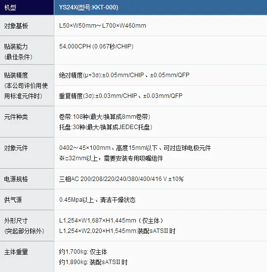 YAMAHA貼片機(jī)-YS24X型產(chǎn)品概述: 54,000CPH(0.067 秒/CHIP)通用貼片機(jī)最佳的貼裝能力 sATSⅡ自動交換式托盤 對應(yīng)供給裝置 L700×W460mm 對應(yīng)超大型基板 對應(yīng)雅馬哈雙搬運(yùn)軌道系統(tǒng) 0402~45×100mm 對應(yīng)元件 H15mm 對應(yīng)高度