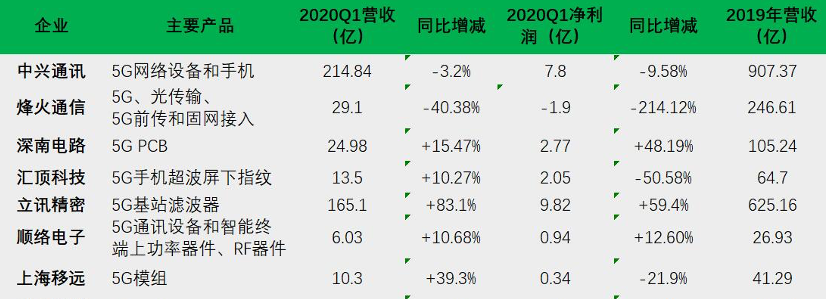 2020年Q1 5G部分上市公司業(yè)績狀況